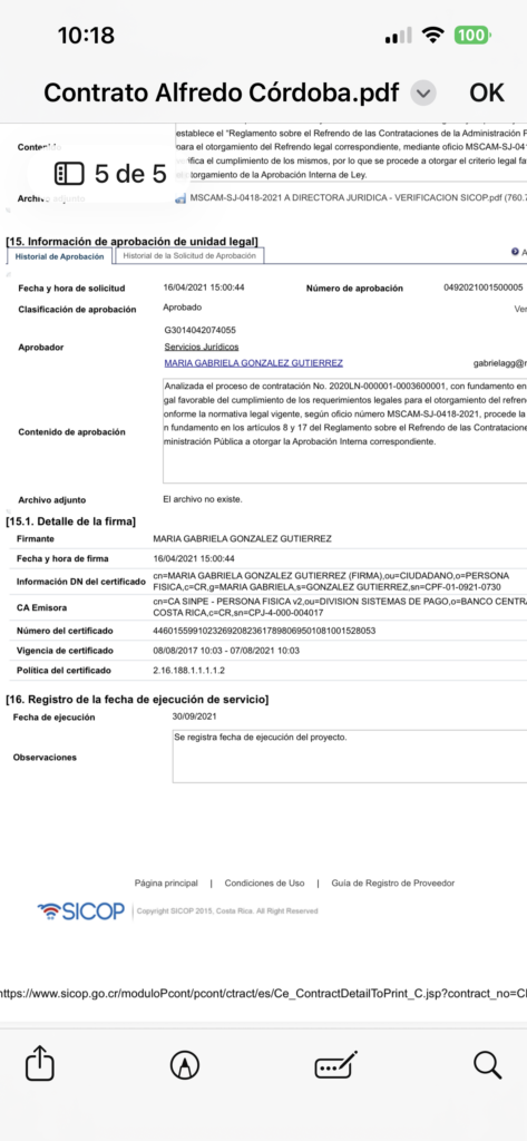 El contrato fue aprobado en marzo de 2021 y contó con el refrendo interno del Departamento de Servicios Jurídicos, tras un criterio legal favorable que validó el cumplimiento de los requisitos establecidos por la normativa vigente.