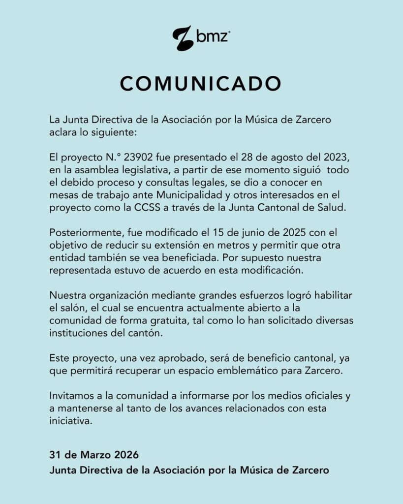 El debate en Zarcero sobre el destino de un terreno estatal suma un nuevo capítulo, luego de que la Asociación por la Música de Zarcero emitiera un comunicado oficial en el que defiende la legalidad y el proceso seguido en torno al proyecto de ley que impulsa la donación del inmueble.